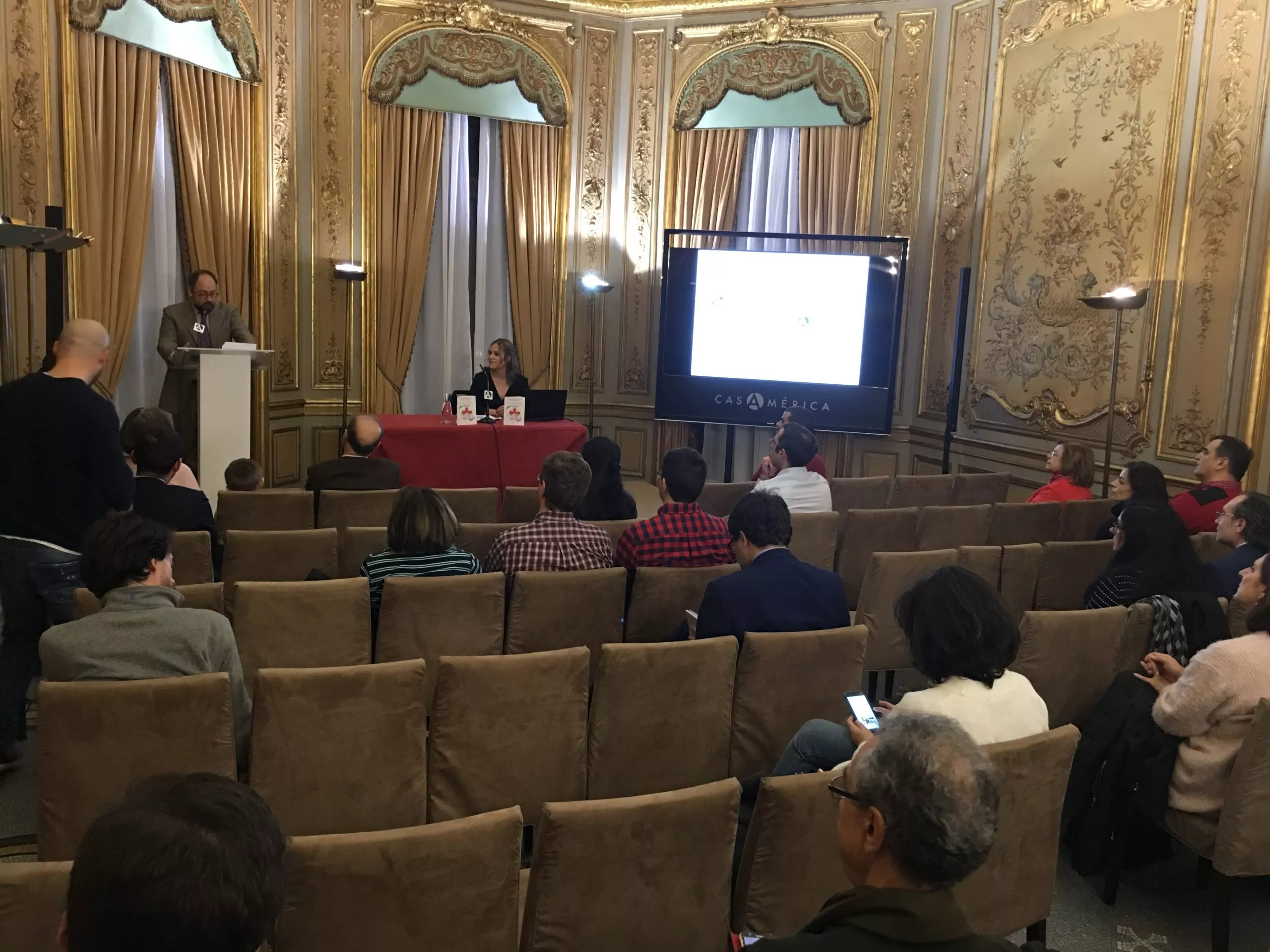 Durante el transcurso de la conferencia, Mercedes fue desgranando los aspectos de las tribus indias que pueblan Canadá y la sala Cervantes de Casa América se llenó de magia cuando la voz de un anciano indio contó un cuento.