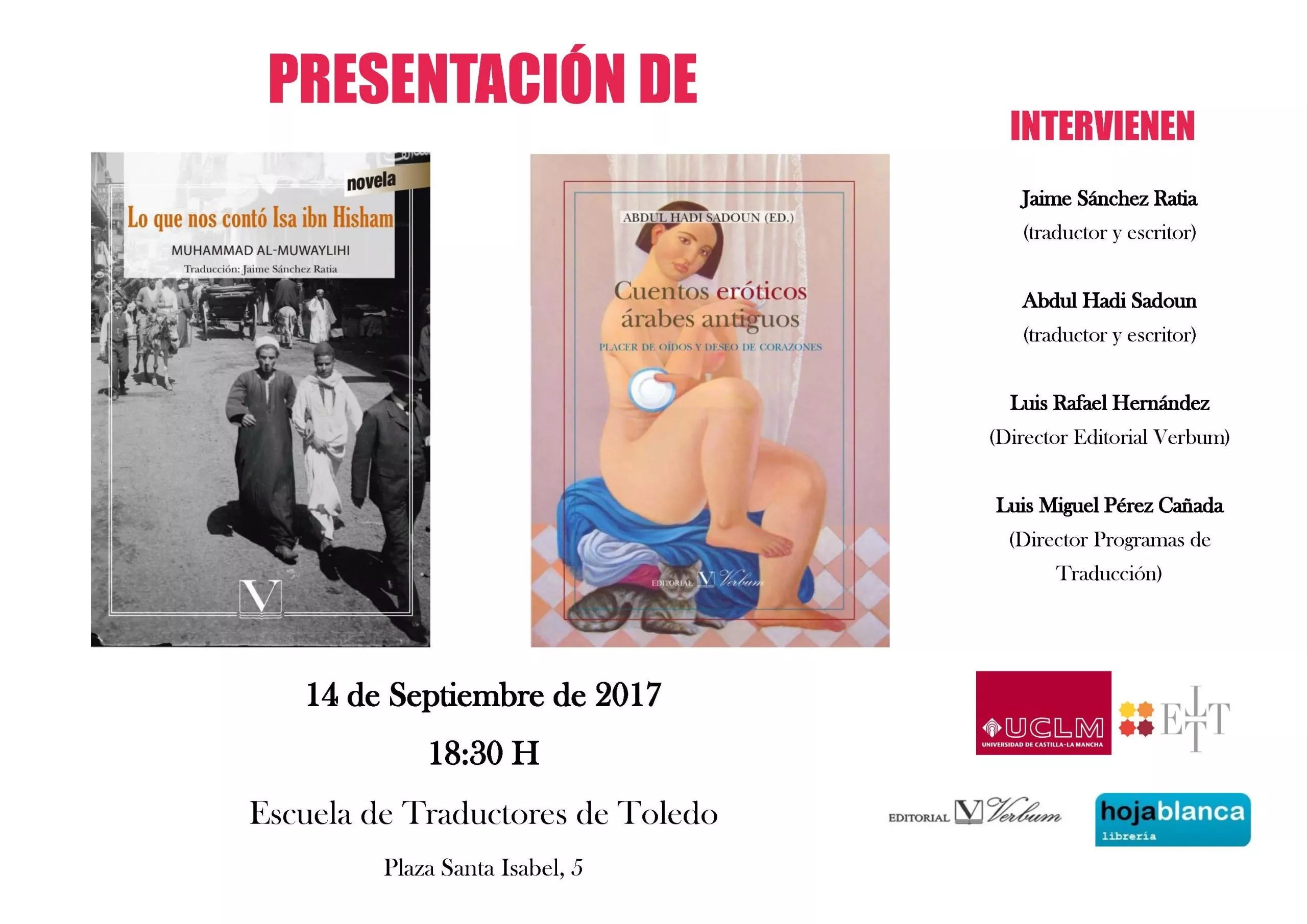 En el acto participan Abdul Hadi Sadoun (director de la Serie Letras árabes, escritor y traductor), Jaime Sánchez Ratia (traductor y escritor), Luis Rafael Hernández (Director de la Editorial Verbum) y Luis Miguel Pérez Cañada (Director del programa de traducción de la Escuela de Traductores de Toledo).