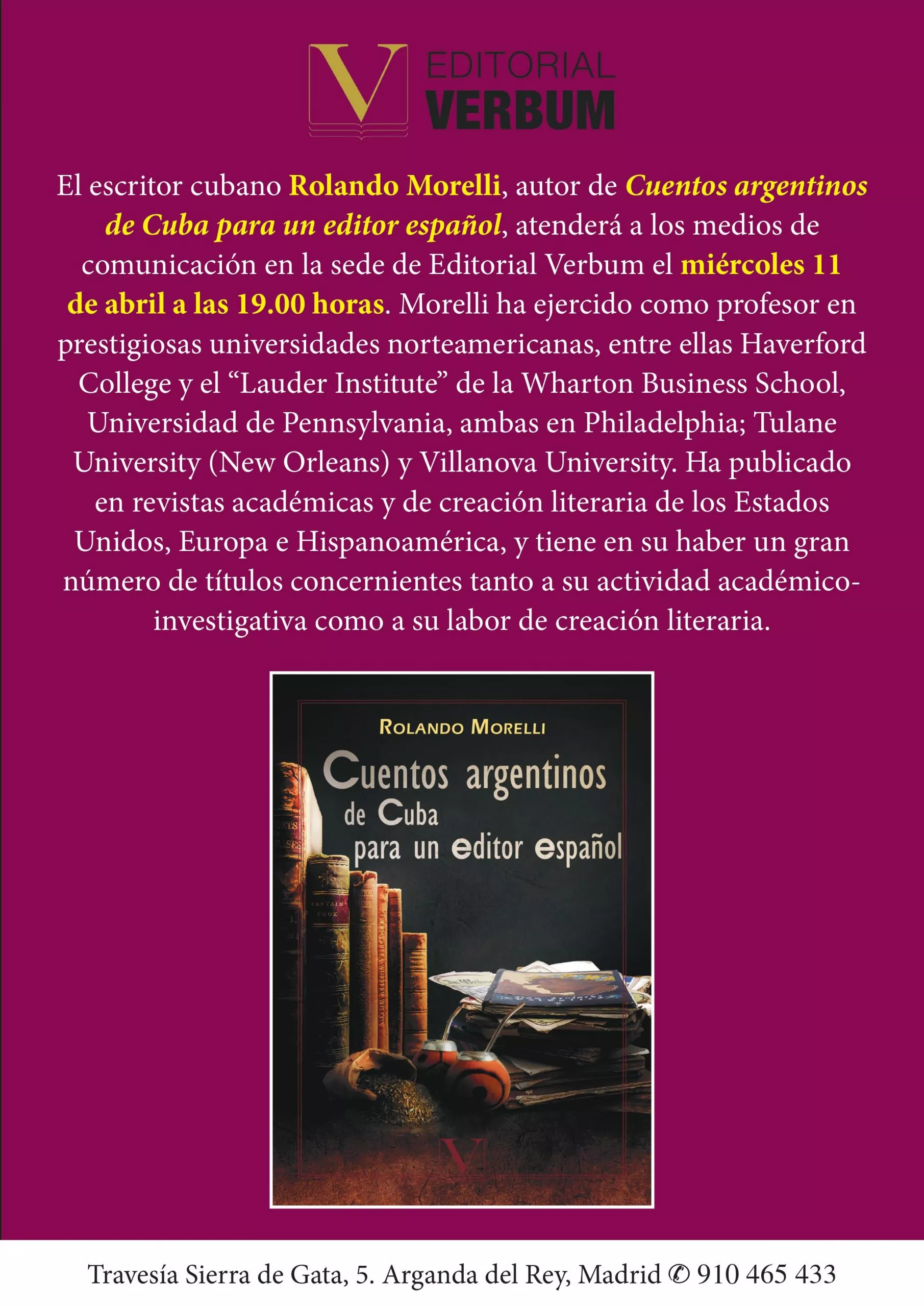 Librería Espacio Cultural Verbum Travesía Sierra de Gata, 5, Arganda del ReyPresentación de «Cuentos argentinos de Cuba para un editor español», [...]