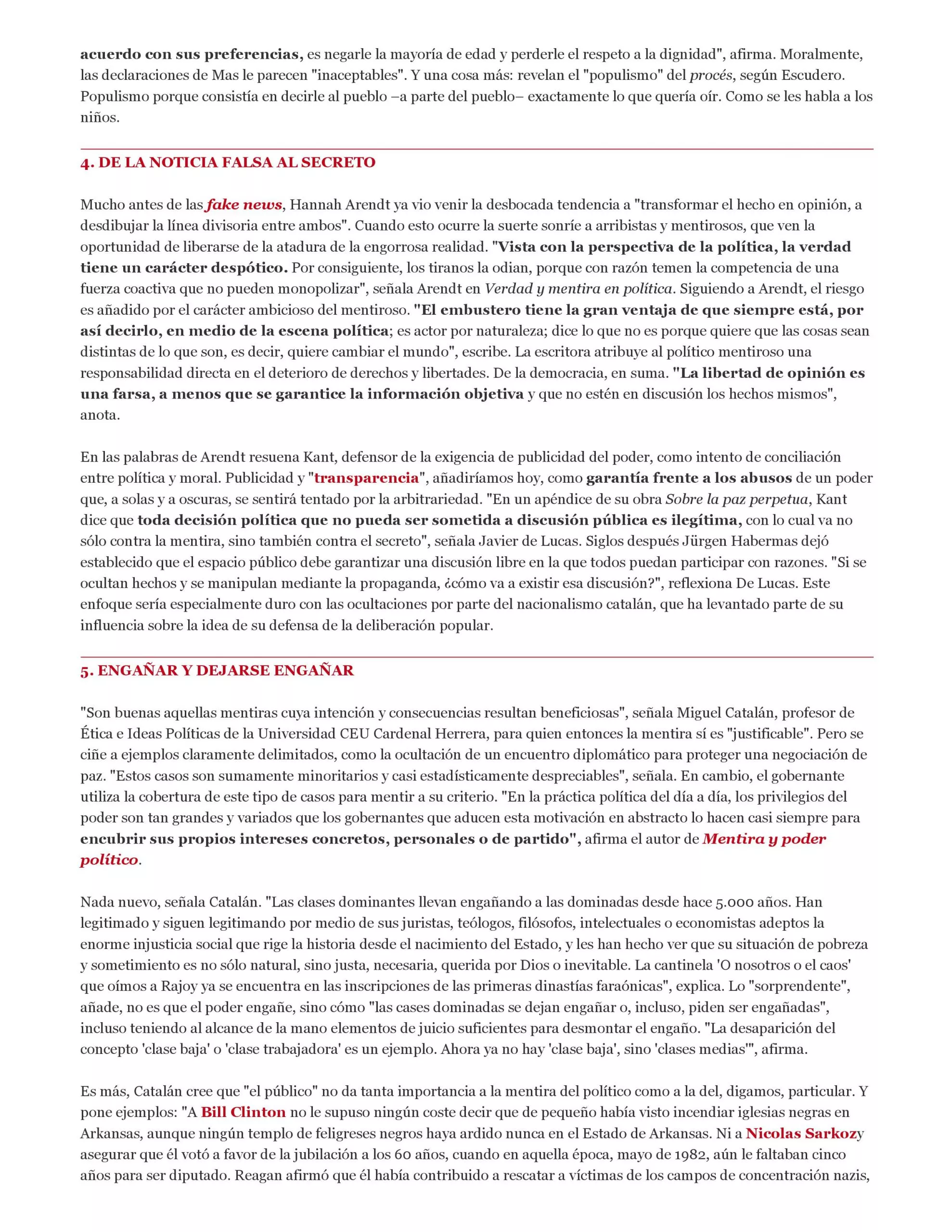 Es más, Catalán cree que «el público» no da tanta importancia a la mentira del político como a la del, digamos, particular. Y pone ejemplos: «A Bill Clinton no le supuso ningún coste decir que de pequeño había visto incendiar iglesias negras en Arkansas, aunque ningún templo de feligreses negros haya ardido nunca en el Estado de Arkansas. Ni a Nicolás Sarkozy asegurar que él votó a favor de la jubilación a los 60 años, cuando en aquella época, mayo de 1982, aún le faltaban cinco años para ser diputado. Reagan afirmó que él había contribuido a rescatar a víctimas de los campos de concentración nazis, y luego se supo que en aquella época estaba en Hollywood. Pero ganó de calle las siguientes elecciones. Así que la falsa heroicidad autobiográfica que ha desacreditado a particulares como Alicia Esteve o Enric Marco, víctimas fingidas del 11-S o del campo de concentración de Flossenbürg, no produce mayor efecto en la carrera de los presidentes de las potencias mundiales». Ahí está la paradoja, continúa el profesor. Una vez obtenida la confianza del votante por parte del candidato, el gobernante la traiciona sin mayor coste, porque de hecho «la sinceridad siempre fue juzgada un síntoma de impericia o ingenuidad del tribuno que lo incapacitaba para el mando».